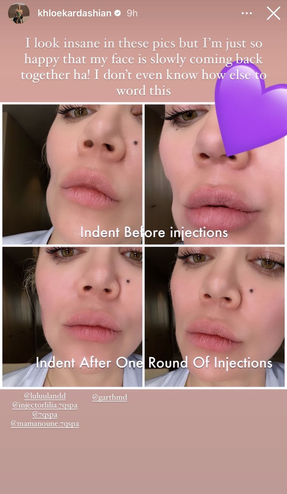 Kardashian then shared a collage of before-and-after photos of getting an indent in her cheek filled in.
