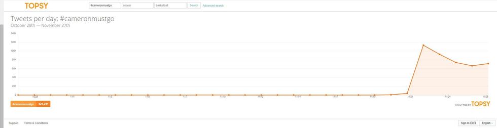 Since Saturday more than 400,000 tweets have been posted with the hashtag #cameronmustgo. It follows more than 90,000 people tweeting their support for Ed Miliband under the hashtag #webacked earlier this month, as part of a campaign to counteract alleged bias against the Labour leader.