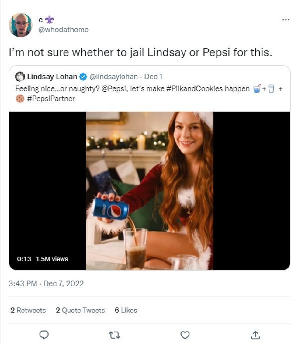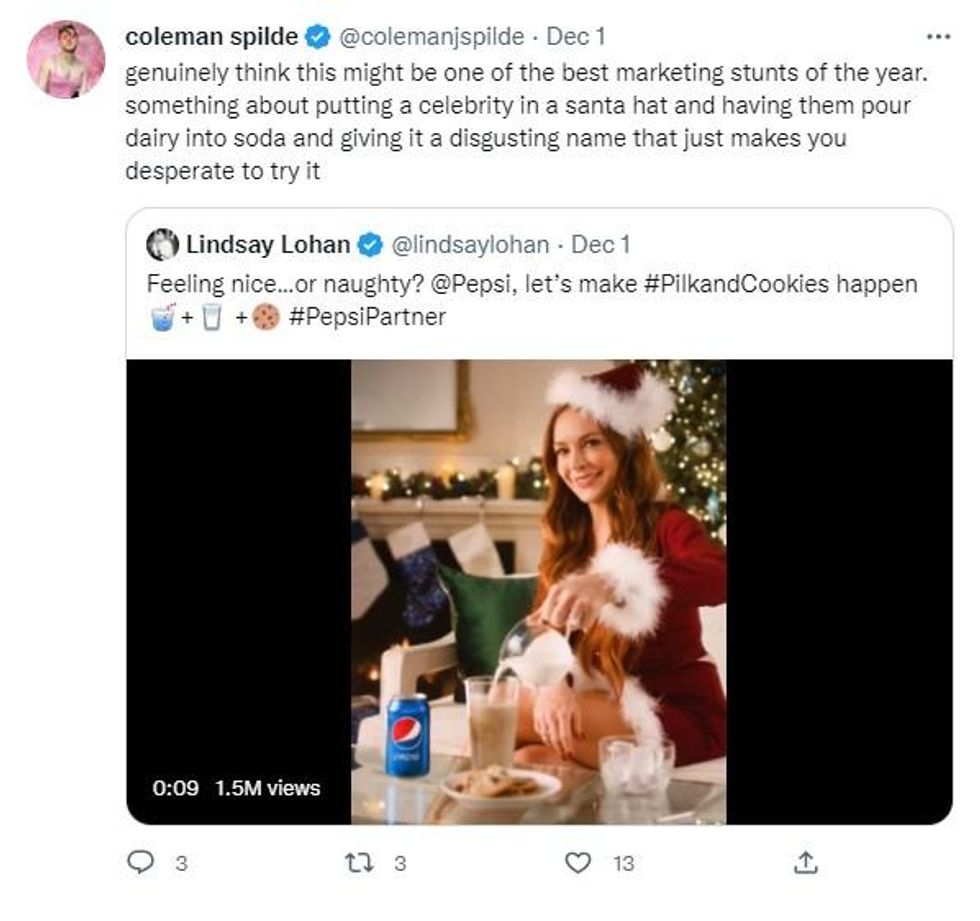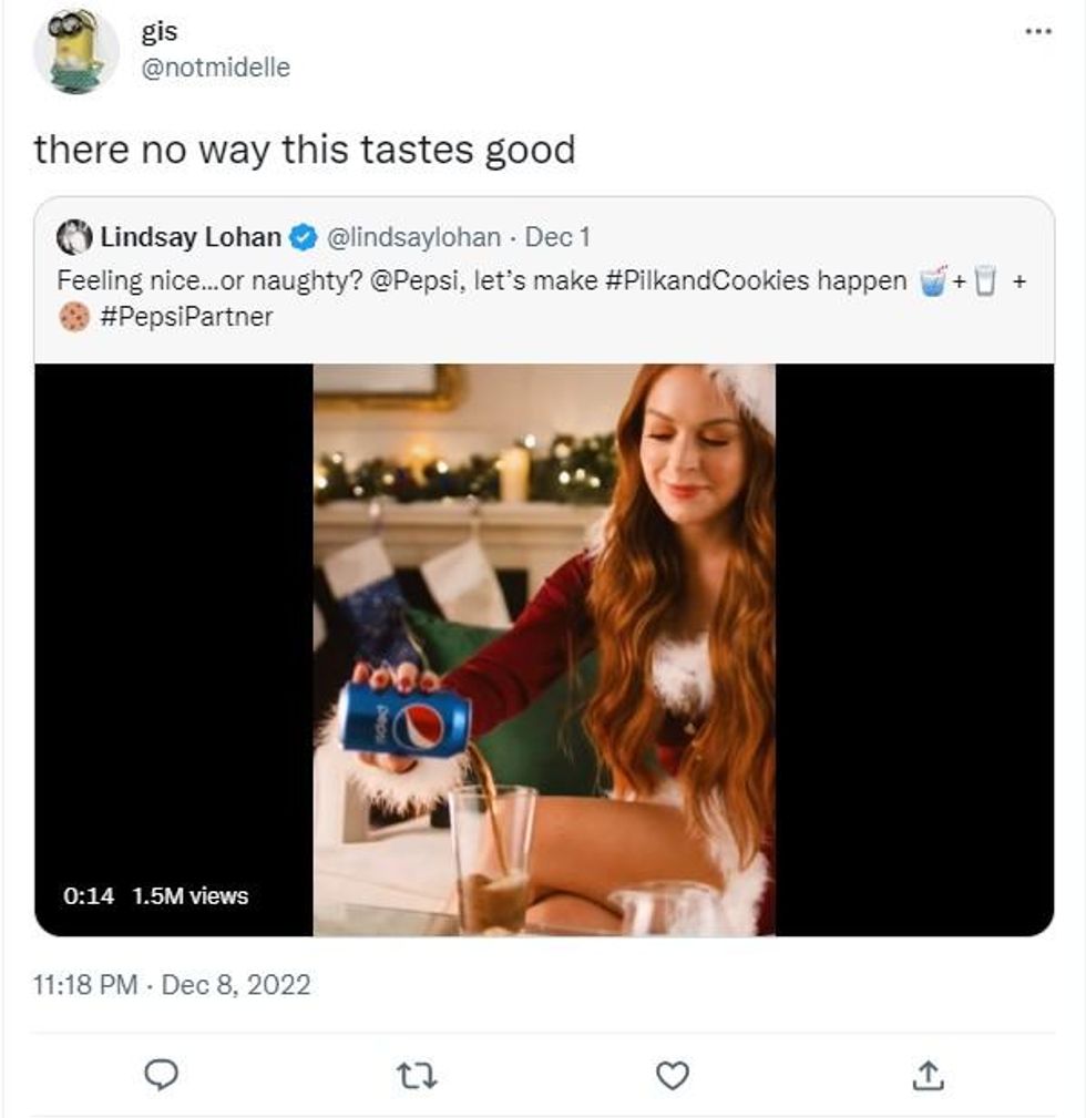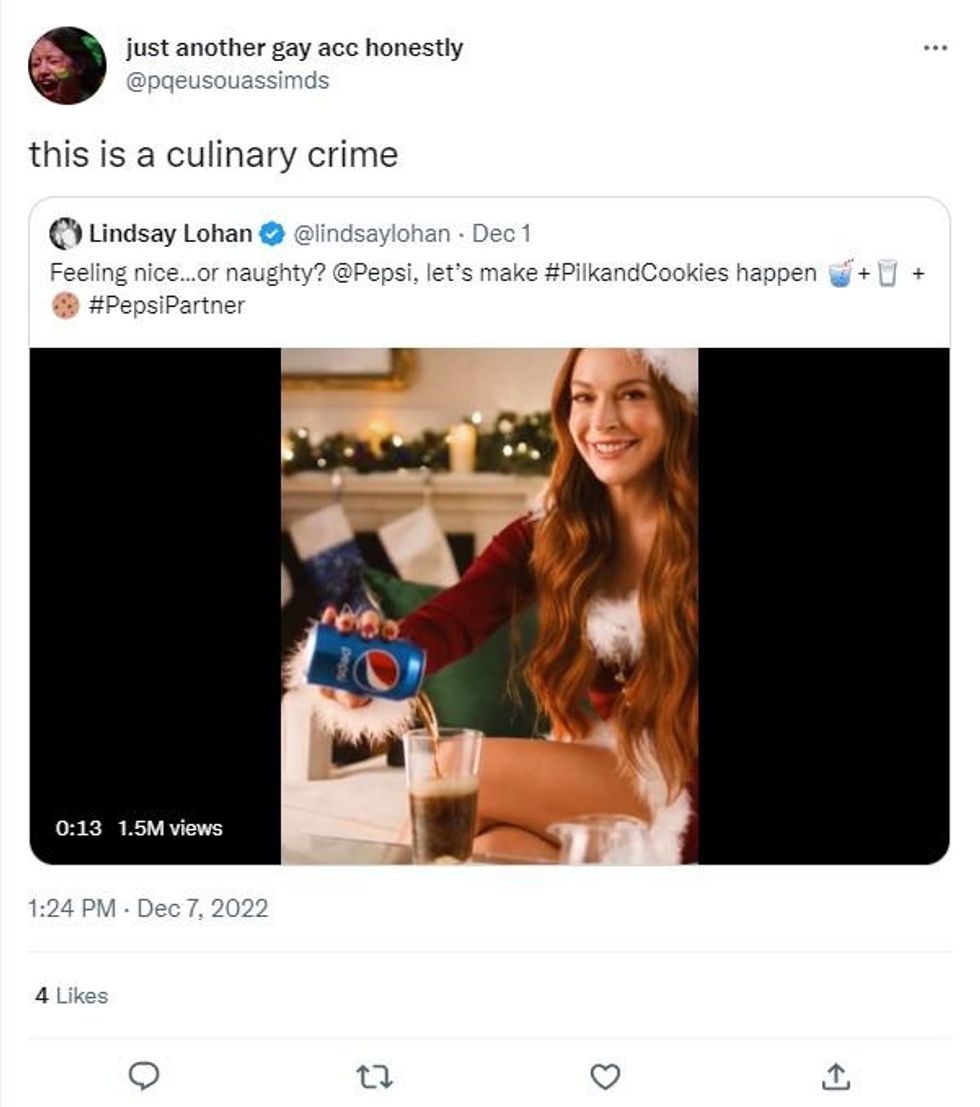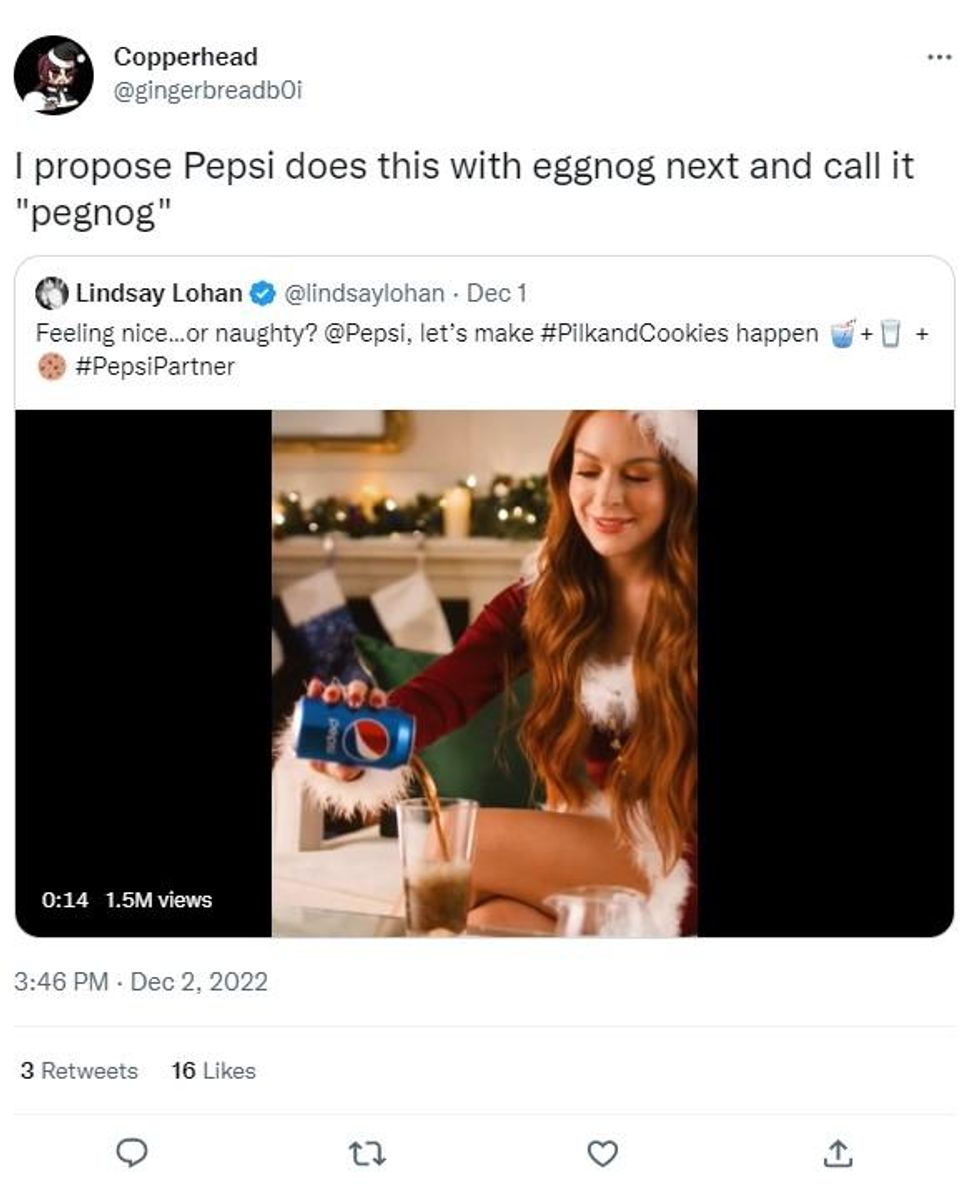 Eggnog, Baileys, mulled wine - there are a variety of beverages people enjoy during the festive season - however, Lindsay Lohan has horrified viewers by knocking back "pilk" in Pepsi's latest Christmas advert.
