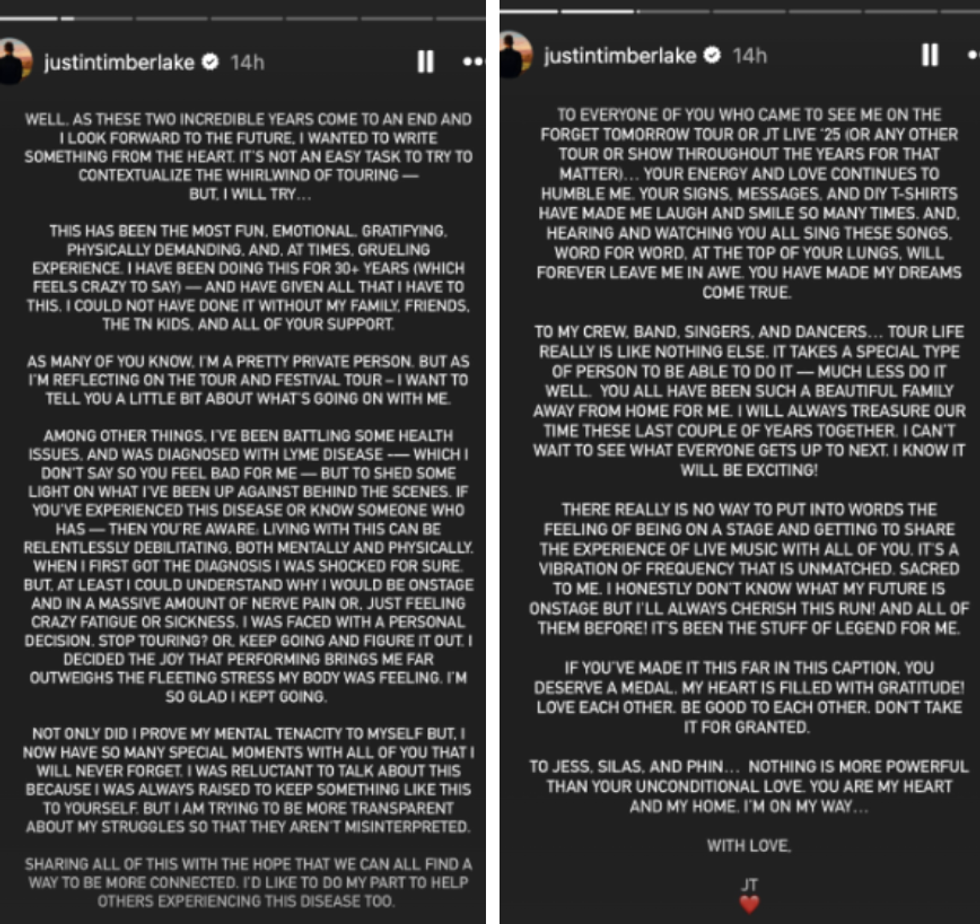 Justin Timberlake Reveals He Was Diagnosed With Lyme Disease Amid Tour