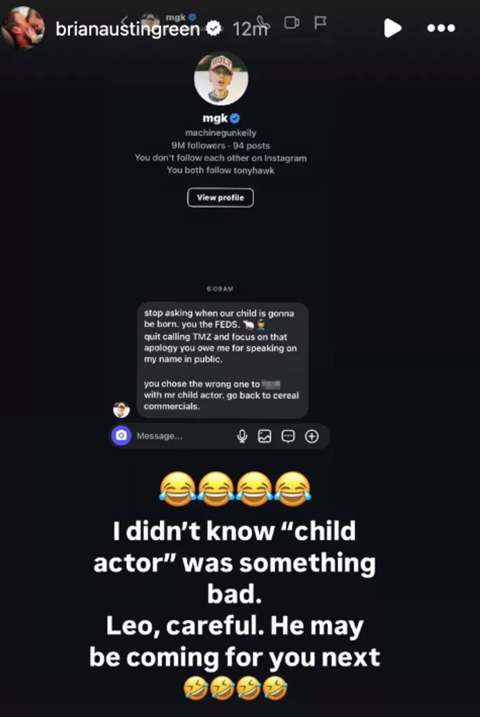 Underneath the screenshot, Green replied with four laughing-face-with-tears emojis and said: “I didn’t know ‘child actor’ was something bad.”