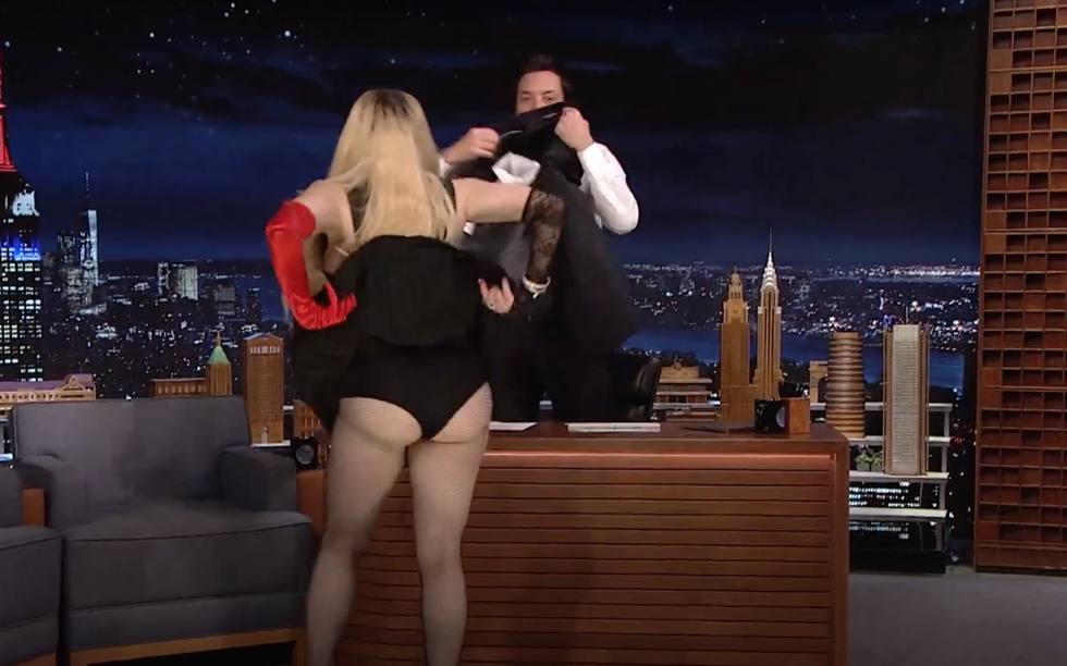 "No one's gonna see anything, my God!" Madonna quips as she gets off Fallon’s desk and makes her way back to her seat. Well, if no one saw anything the first time around, Madonna made sure the audience got a peek by lifting her skirt in a cheeky move.
