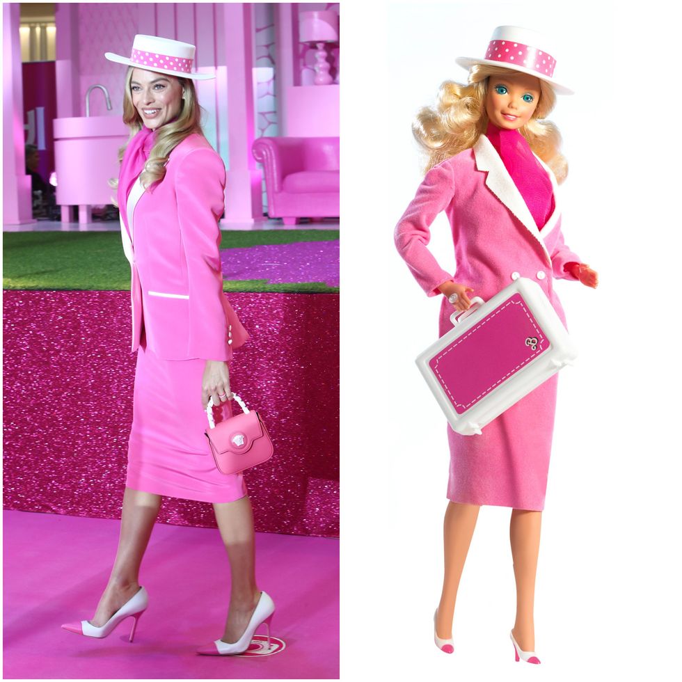 Dress up with a white brimmed hat, hot pink blazer, pencil skirt and high heels - not forgetting the rhinestone phone - Robbie's outfit was a throwback to the 1985 Day-to-Night Barbie, with this being the day look.
