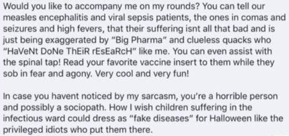 Unfortunately for the unidentified antivaxxer (let's run with "Karen"), it appeared that a furious doctor was ready with a heartbreaking response.