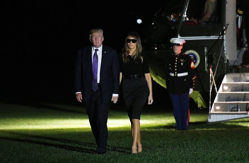 Returning from a visit to the survivors of the Las Vegas shootings, First Lady Melania Trump emerged into the night from Marine One, still wearing her sunglasses.