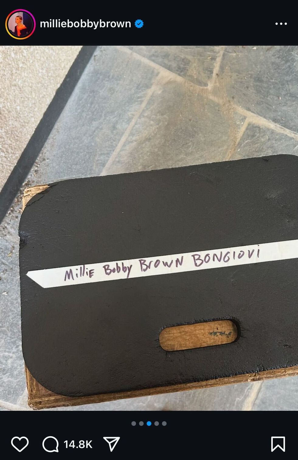 Social media users particularly noticed the third photo in the post of a black slate with Bobby Brown's name written on a piece of tape which had "Millie Bobby Brown".