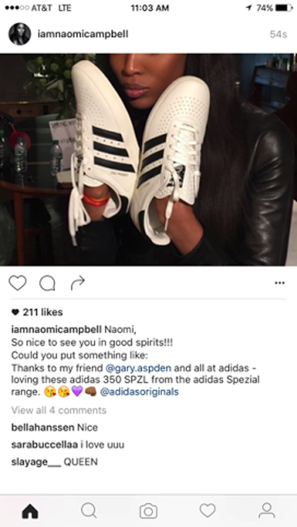 Naomi, So nice to see you in good spirits!!! Could you put something like: Thanks to my friend @gary.aspden and all at adidas - loving these adidas 350 SPZL from the adidas Spezial range. @adidasoriginals