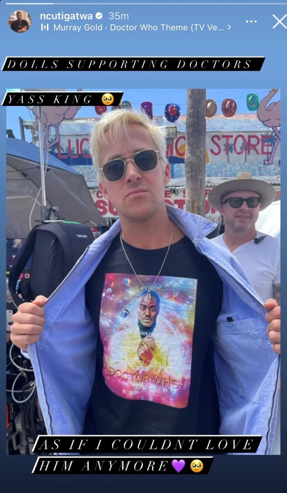 The Rwanda-born actor shared a picture of Gosling, 41, flashing a Doctor Who T-Shirt while on set filming Barbie – a forthcoming movie bringing to life the eponymous doll and her male counterpart Ken, who is played by Gosling.