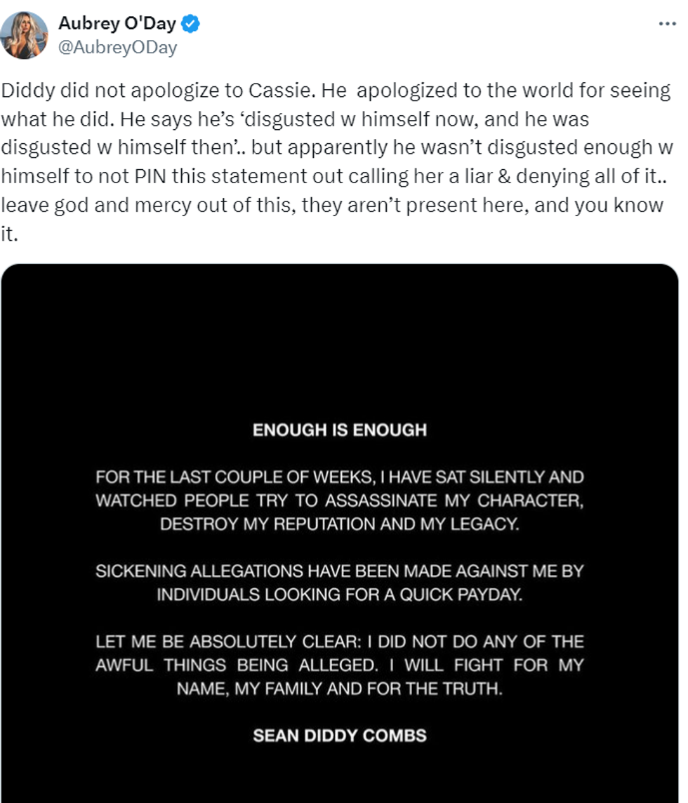 Aubrey O’Day has been a longtime critic of Diddy. She condemned the musician for not apologising to Ventura, writing on Twitter/X: “Diddy did not apologize to Cassie. He apologized to the world for seeing what he did.”