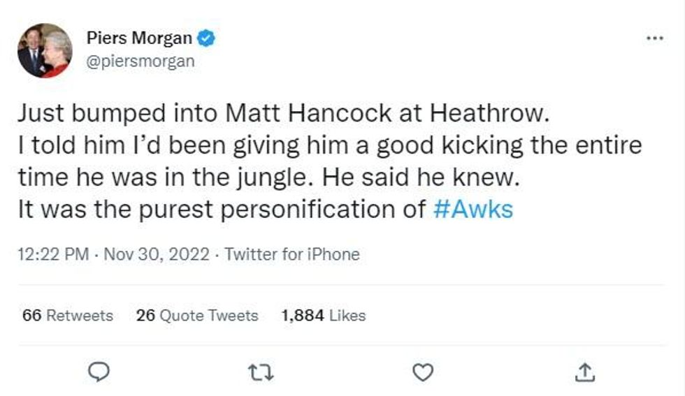 "Just bumped into Matt Hancock at Heathrow. I told him I’d been giving him a good kicking the entire time he was in the jungle. He said he knew. It was the purest personification of #Awks," Morgan tweeted, recalling the encounter.