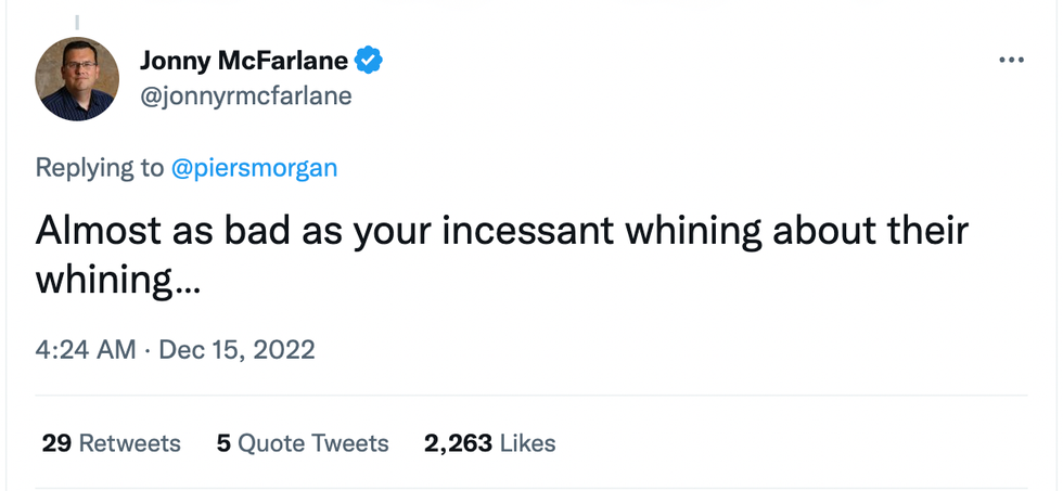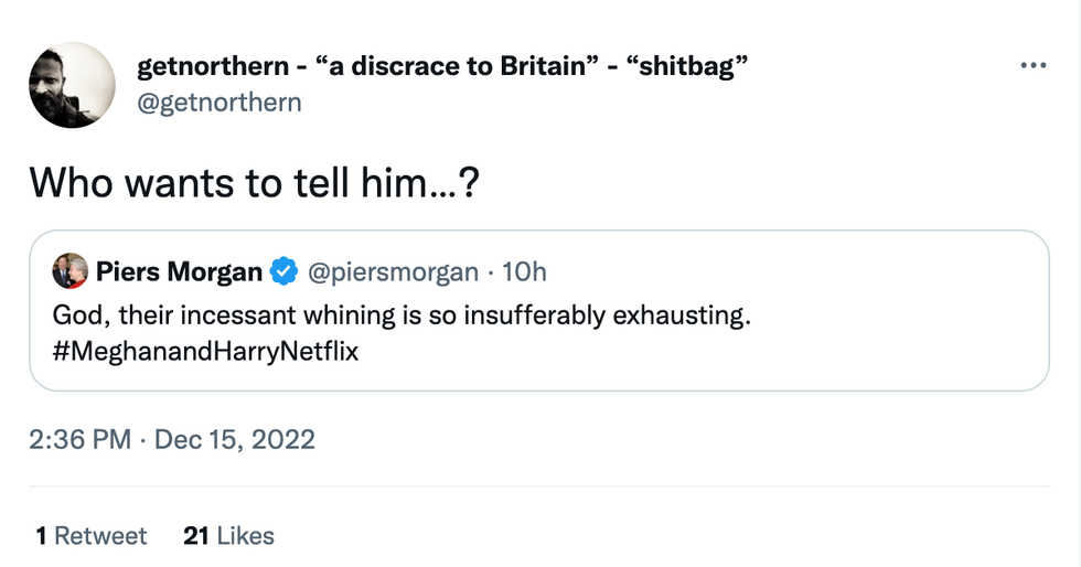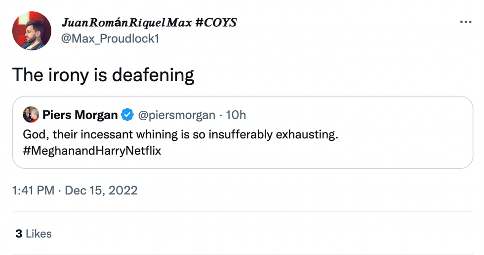 The irony in Morgan's statement was pointed out to him by followers who reminded the Piers Morgan Uncensored host that he often whines about Meghan and Prince Harry.