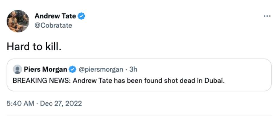 One of the tweets falsely claimed that the controversial influencer Andrew Tate had been 'shot dead in Dubai.' This was quickly proven to be bogus when Tate himself responded to the tweet with the message 'Hard to kill.'