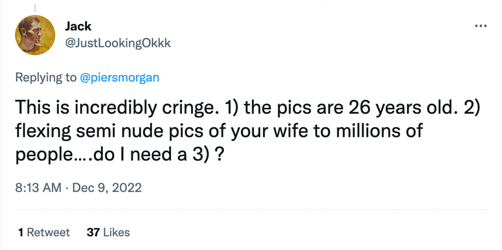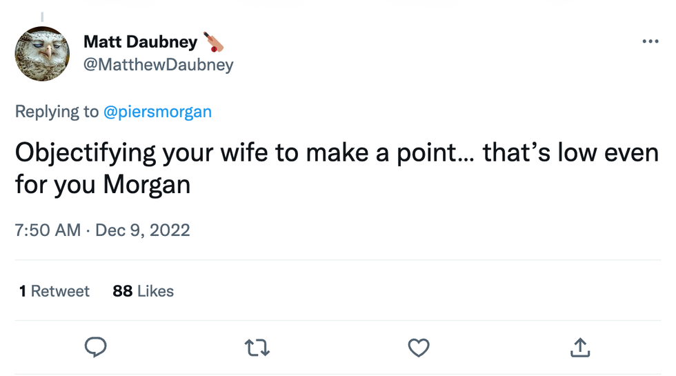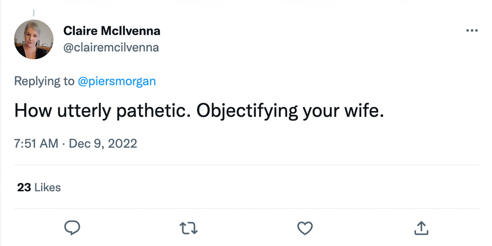\u201cAll the trolls raging that I only criticise Meghan Markle because I \u2018fancied\u2019 her & then got upset when she ghosted me\u2026 have reminded me that I forgot to publicly wish my wife Celia a happy birthday yesterday. (And yes, she knows she lucked out\u2026. \ud83e\udd23)\u201d— Piers Morgan (@Piers Morgan) 1670589907