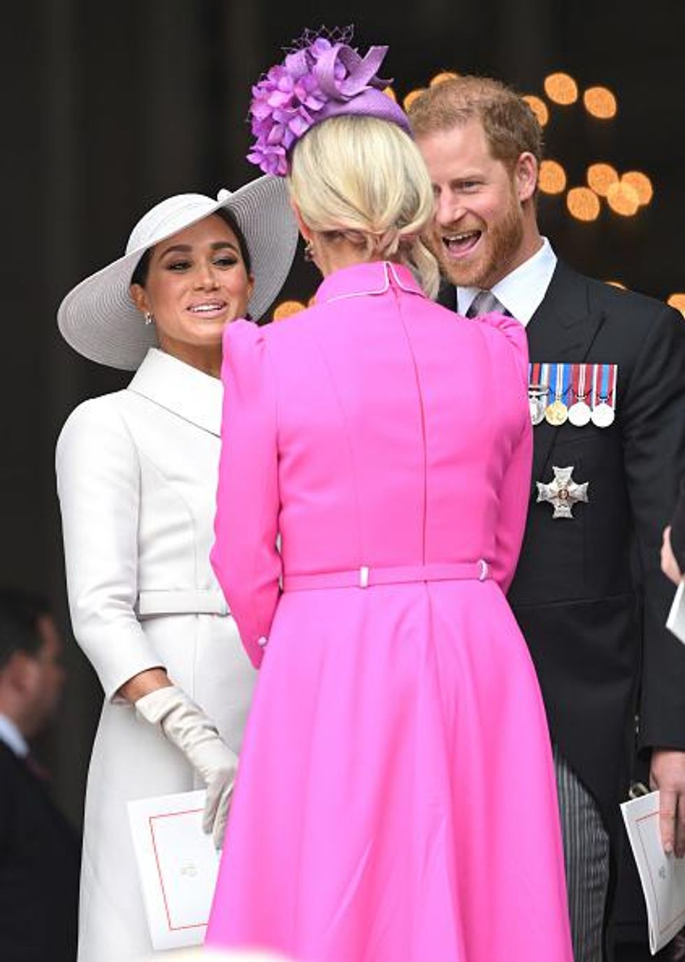 Shortly after attending thanksgiving service at St. Paul's Cathedral, Prince Harry and Meghan could be seen standing next to Harry's cousin and having a friendly conversation.