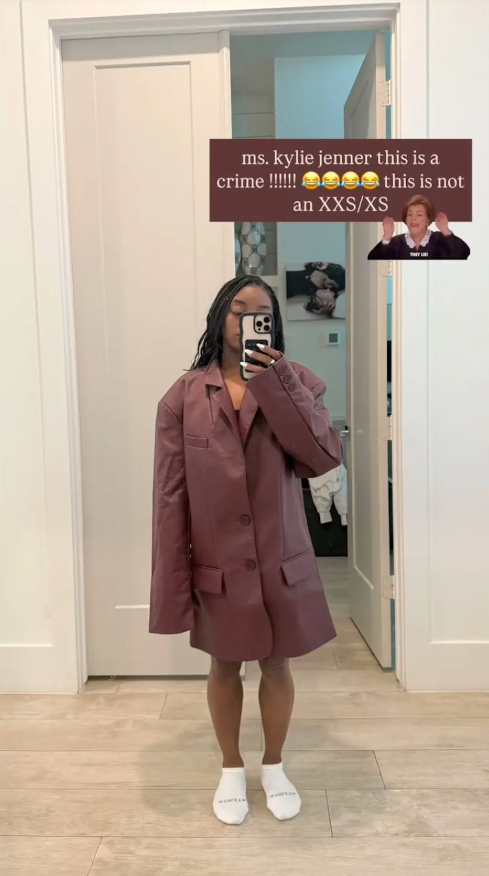 Captioning the photo, in which the burgundy blazer is swallowing her up, Biles wrote: “Ms. Kylie Jenner this is a crime !!!!!!”