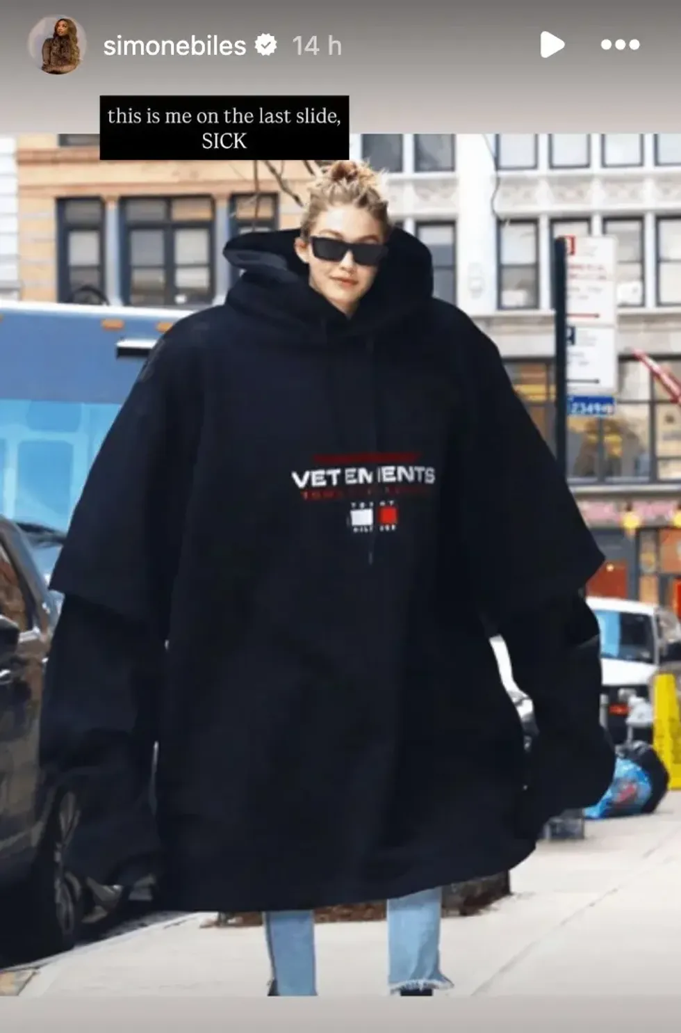 In a follow-up Instagram Story, she posted an edited photo of Gigi Hadid wearing a comically gigantic Vetements hoodie and wrote: “This is me on the last slide, SICK.”