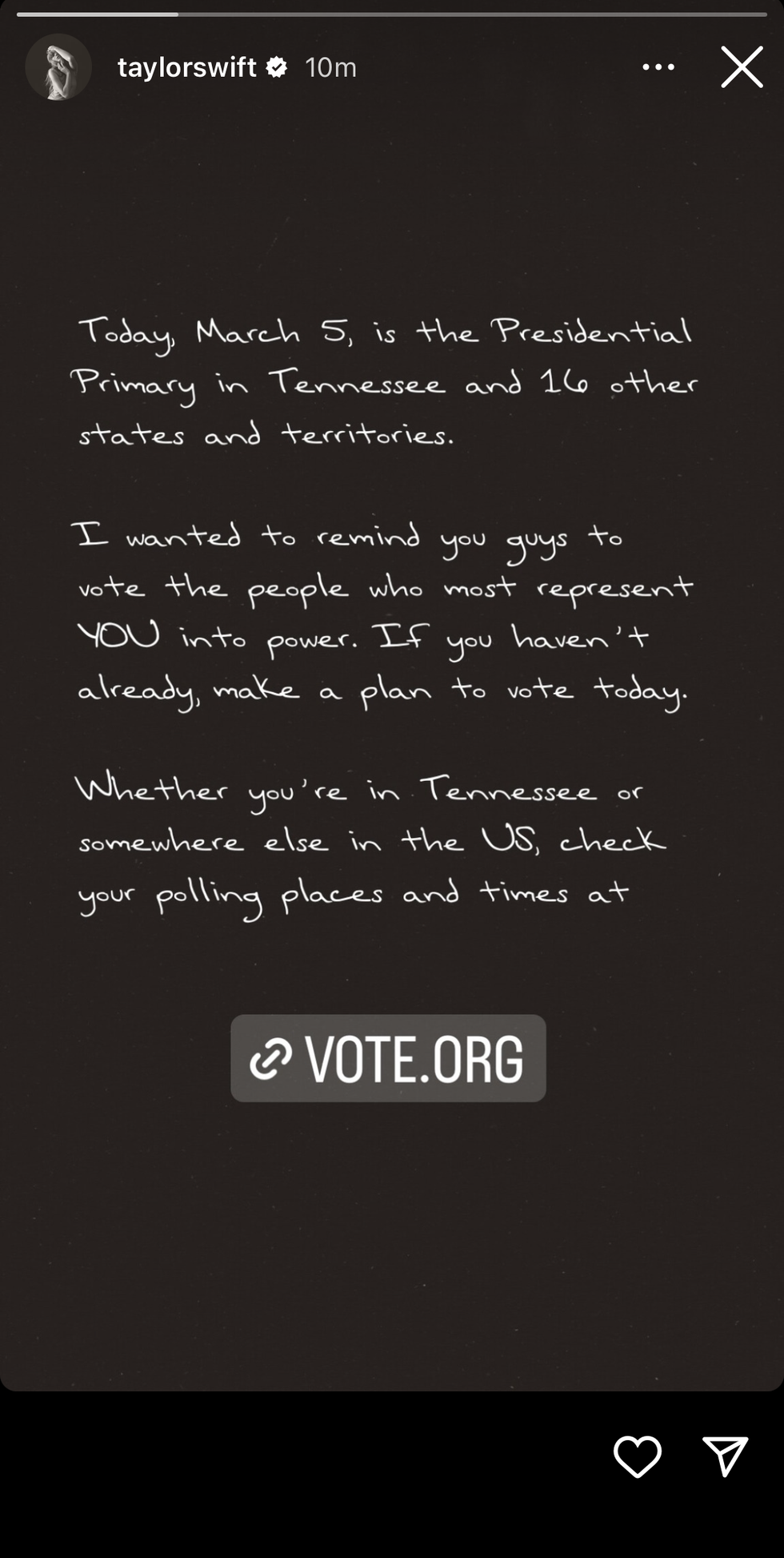 "Today, March 5, is the Presidential Primary in Tennessee and 16 other states and territories," Swift wrote.