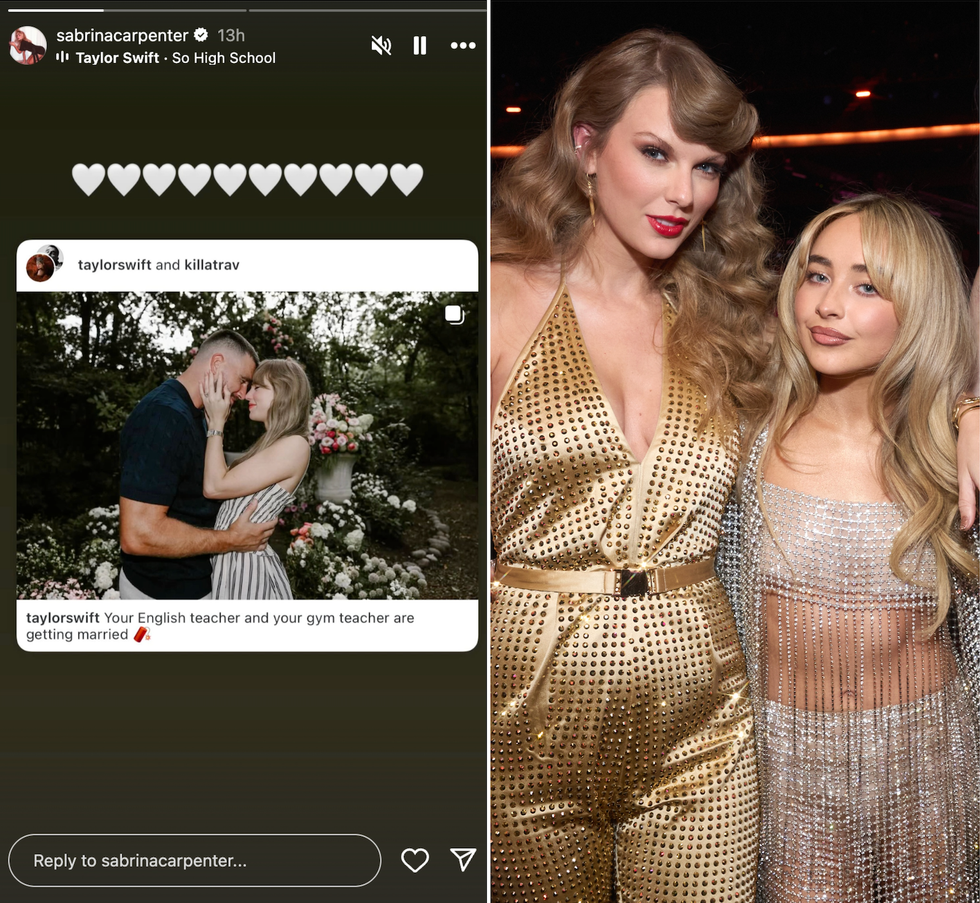 The 'Manchild' singer, who supported Swift on the Eras Tour and is set to feature on Swift's song 'The Life of a Showgirl' from the upcoming album of the same name, took to her Instagram Story to share the engagement post and some supportive white hearts.