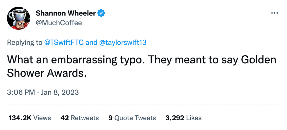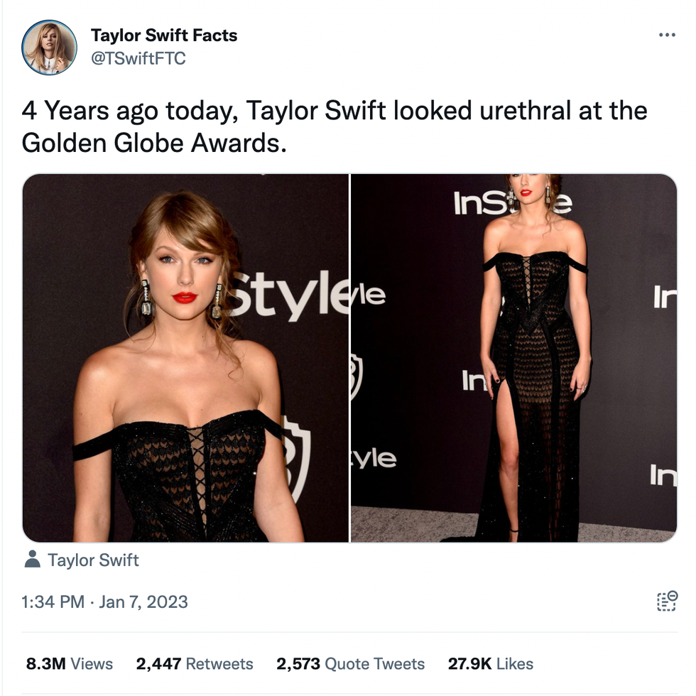 However, instead of saying "ethereal" which the Twitter user seemingly meant to say, they wrote, "4 Years ago today, Taylor Swift looked urethral at the Golden Globe Awards."