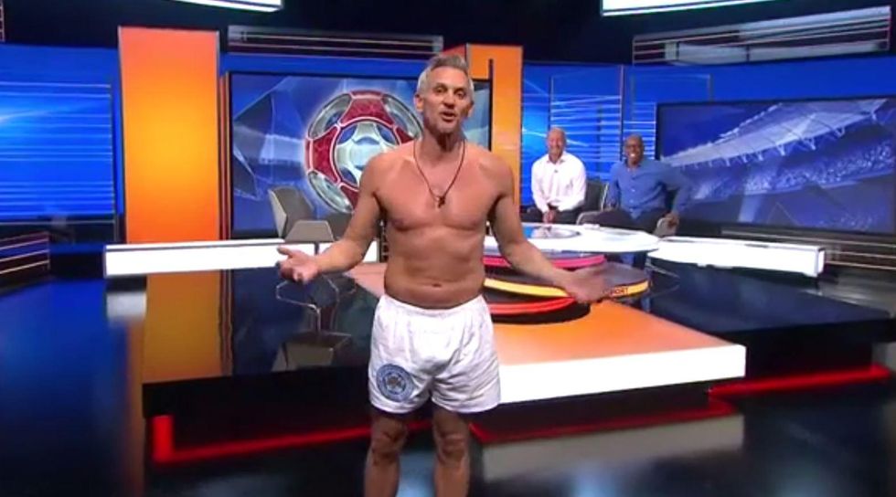 Gary Lineker wore a pair of boxer shorts to present Match of the Day on Saturday night to fulfill a pledge he made if his former side Leicester City won the title last season: