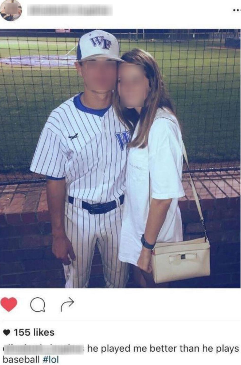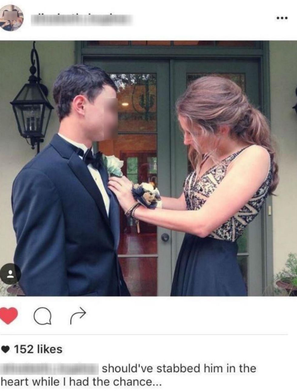 In a picture where she is pinning a flower to his suit, she wrote "should've stabbed him in the heart while I had the chance," and under a photo of them at a baseball stadium, "he played me better than he plays baseball". Ouch.