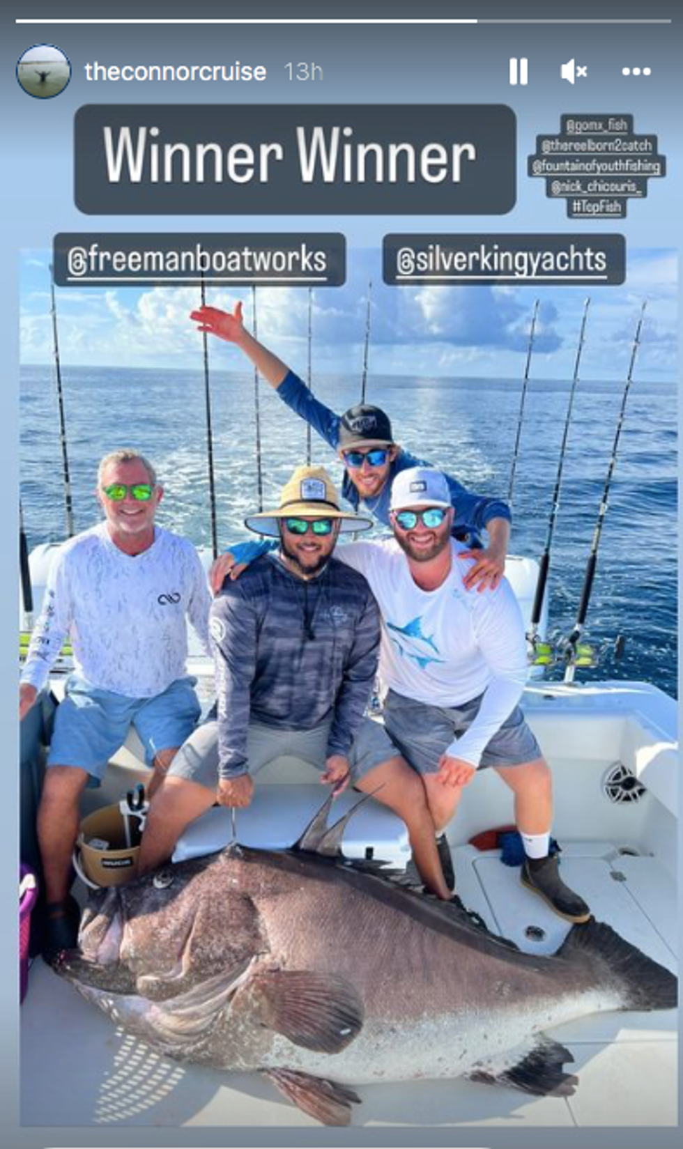 He also posted a picture of the group with the catch, adding the caption: “Got it done yesterday with the boys. 301# Warsaw on the hand crank @gomx_fish @freemanboatworks @nick_chicouris_ @thereelborn2catch @fountainofyouthfishing #TopFish.”