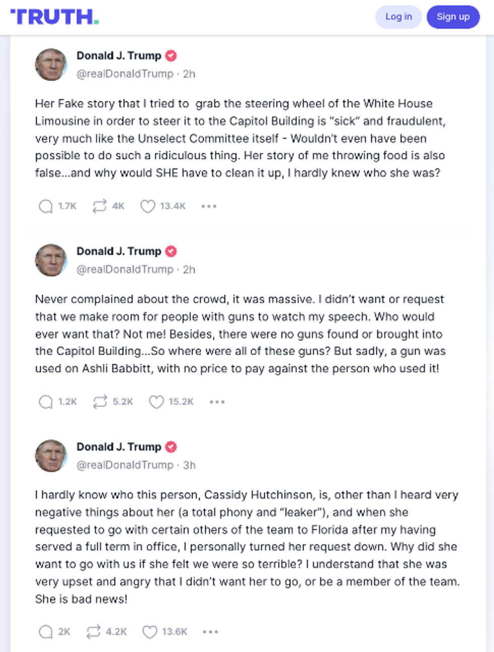 In three long posts, Trump claimed he did not know Hutchinson, her story was fake and claimed multiple points of her testimony were lies