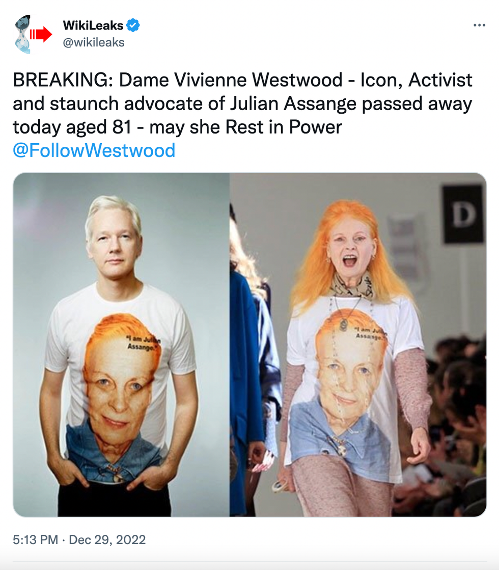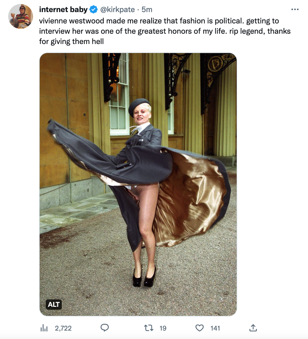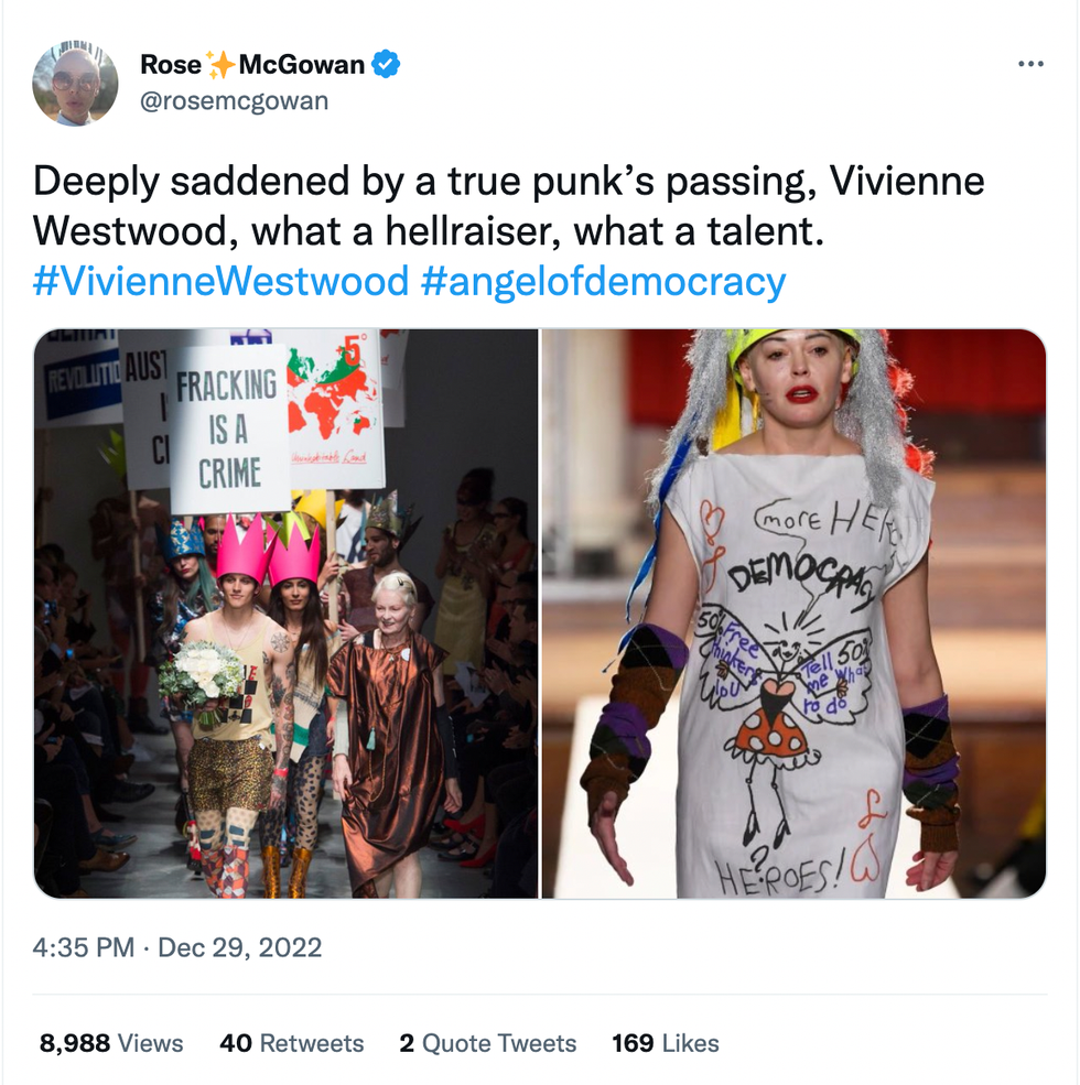 \u201crest in peace vivienne westwood, you'll be always be remembered in fashion and pop culture\u201d— NOSTALGIA (@NOSTALGIA) 1672351625