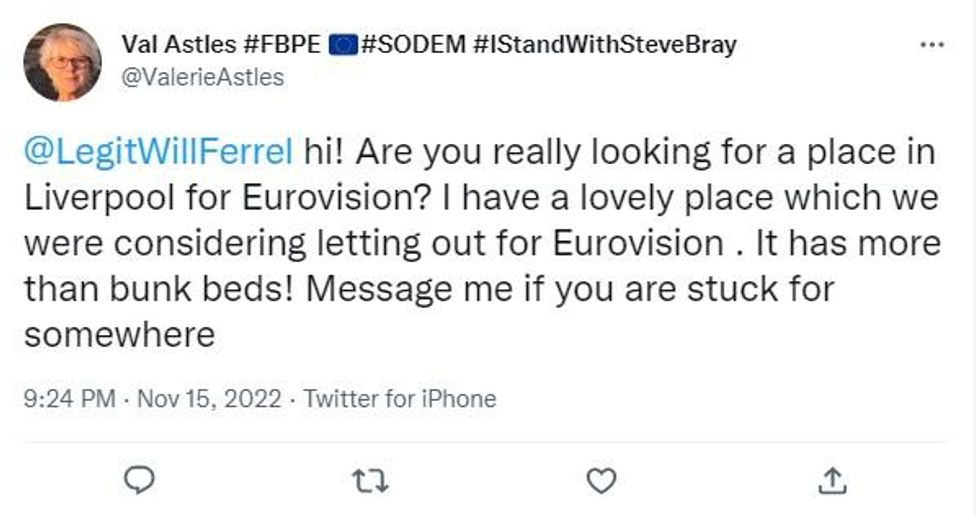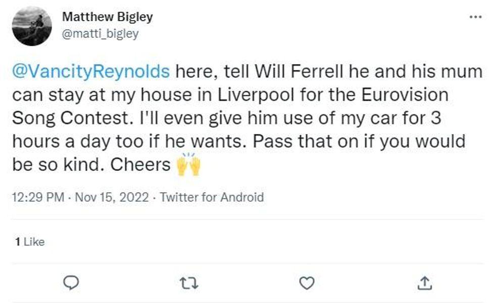 Ball asked for any of her listeners who are "willing to put up Will Ferrell and his mum in Liverpool or the Liverpool area during Eurovision" to get in contact.