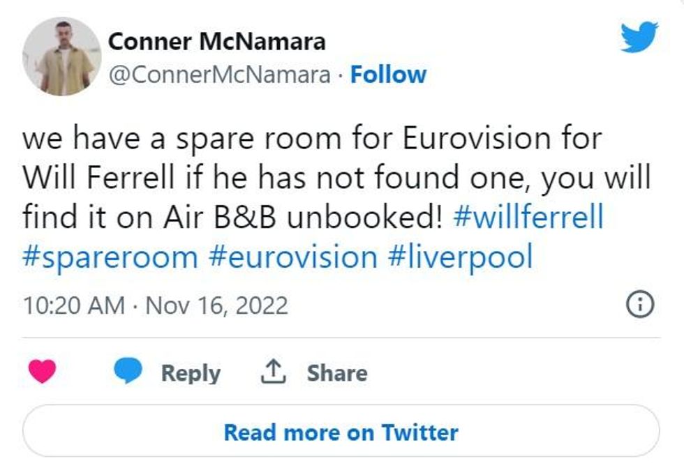 Will Ferrell wants to take his mother to next's Eurovision Song Contest in Liverpool and has asked if any Scousers have a spare room for them to stay in.