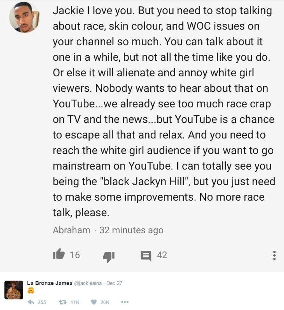 Nobody wants to hear about that on YouTube…we already see too much race crap on TV and the news…but YouTube is a chance to escape all that and relax.