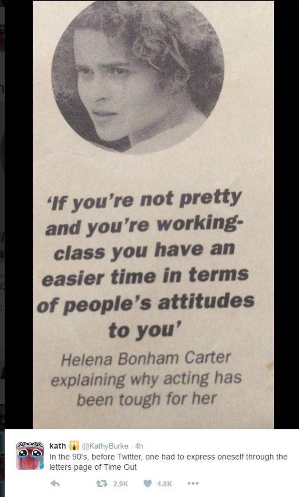In an interview with the magazine back in the 1990s, actress Helena Bonham-Carter lamented her struggles with being pretty and middle-class: