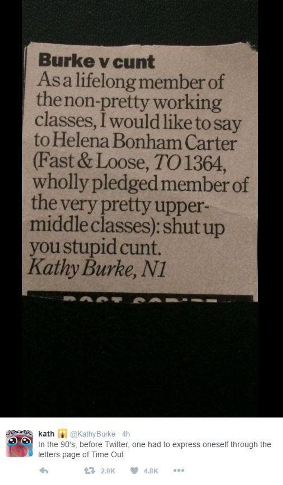 However comedian, theatre director and all around hilarious human being Kathy Burke demonstrated that, before the invention of Twitter, all you needed was the letter pages of Time Out: