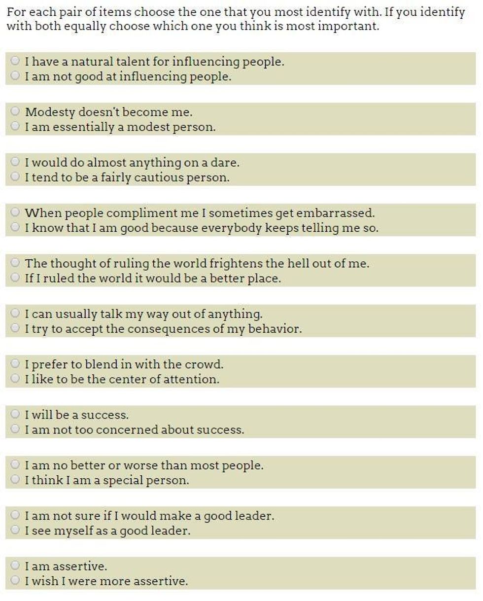 However, a promising test, developed by psychologists Robert Raskin and Howard Terry has recently resurfaced online. The duo created a simple, 40-item questionnaire with paired statements.