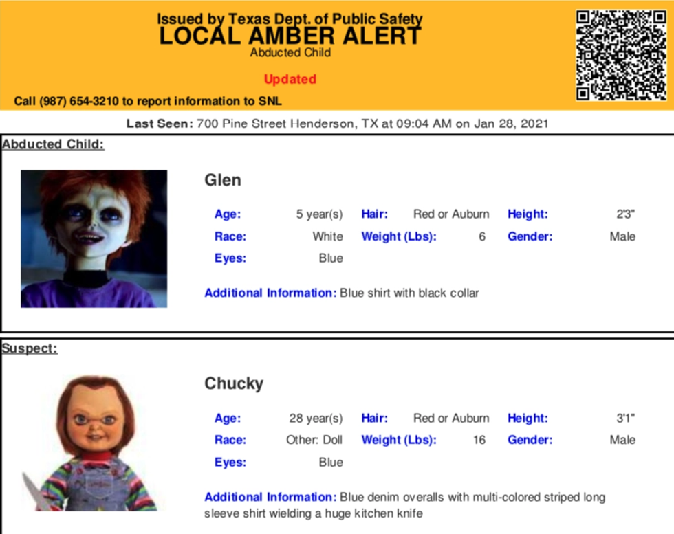Residents of Texas might have received a strange message on Friday morning when an Amber Alert from the Texas Alerts System told them to be on the lookout for Chucky - the possessed knife-wielding doll from the Child’s Play films.