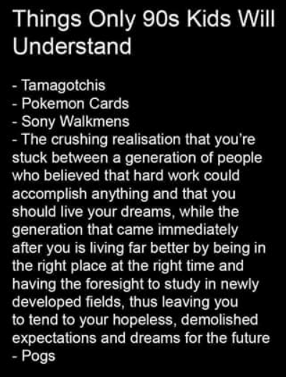 Taking things on a different track, the post then reads: “The crushing realisation that you're stuck between a generation of people who believed that hard work could accomplish anything and that you should live your dreams, while the generation that came after you is living far better by being in the right place at the right time and having the foresight to study in newly developed field, thus leaving you to tend to your hopeless, demolished expectations and dreams for the future”.