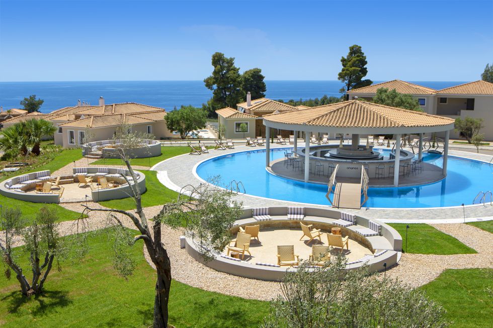 Tucked away on the beach of Agia Paraskevi village, the resort is situated on a hilltop that looks out onto stunning views of the Aegean Sea.