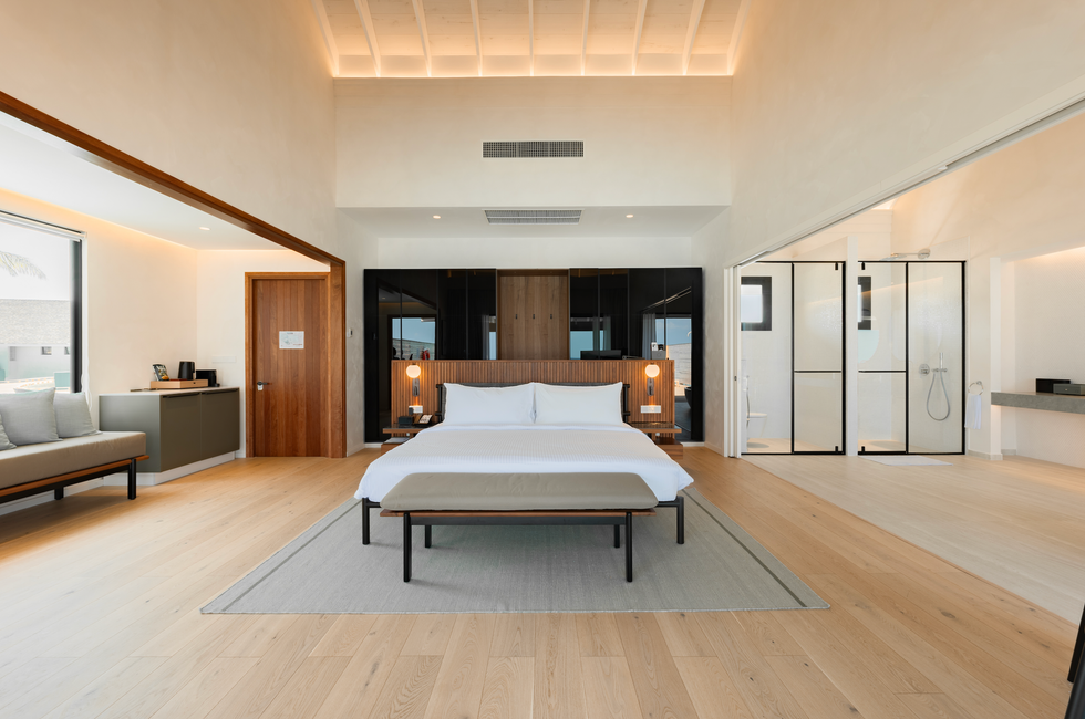 Decked out with woody tones, high ceilings, and neutral decor, stillness-inducing details are found in every nook of the room, which spans from a kitchenette to the King-sized bed, a dressing room, and a bathroom that trumps most other resorts when it comes to space - think rainfall shower, dual sinks, a vanity table, and a freestanding tub with unobstructed views onto the lagoon.