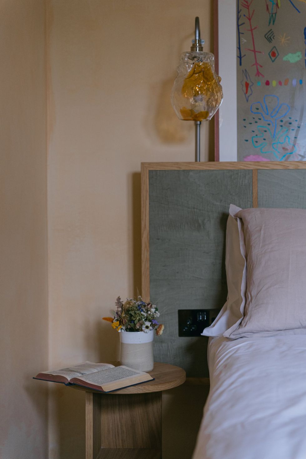 Each room is furnished with bedside tables crated using wood from the estate. Lampshades are made from recycled glass, and fabrics from recycled textiles.