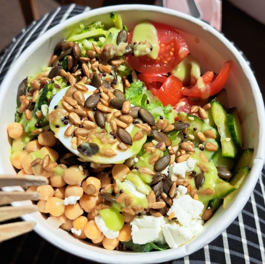 And so, Poke House has come up with a bowl with quinoa & kale forming the base, cherry tomatoes, cucumber, courgette, chickpeas, spring onion, feta and a boiled egg bringing up the rear as toppings and avocado cream and tamari seeds topping it all off.