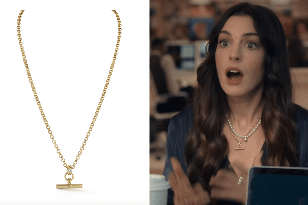 Between turned-up jeans and chunky Chanel Grandad sandals, there's one piece that Hathaway's character, now-seasoned journalist, Andy, wears consistently throughout the sequel: a $9,000 diamond T-bar necklace.