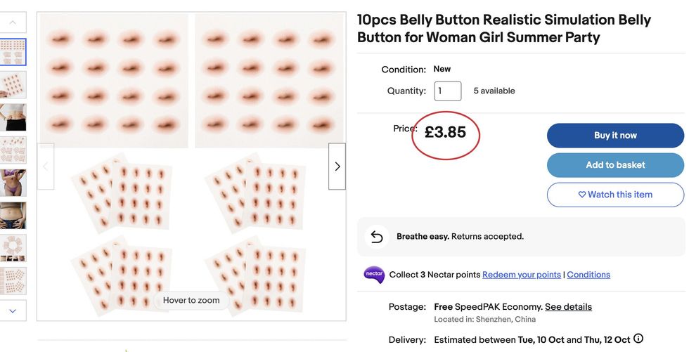 The curious beauty product can be bought on multiple websites, including eBay, where you can buy a pack of 10 sheets for £3.85. The listing appears as: "Realistic simulation belly button for woman girl summer party."