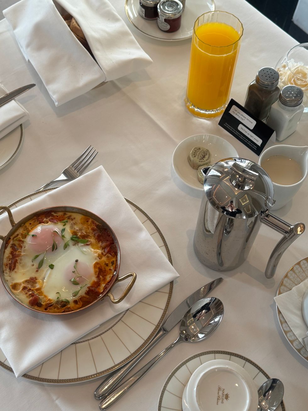 The next morning was slow in the best way. Breakfast arrived on a polished cart: shakshuka with just the right amount of spice, fresh bread, and tea, all placed by the window while I watched people heading to work.
