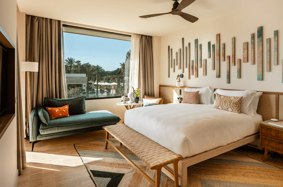 Its Instagram factor continues into its rooms too, with the details embodying all things Balearic; whether in the woven accessories, or splashes of ochre and teal.