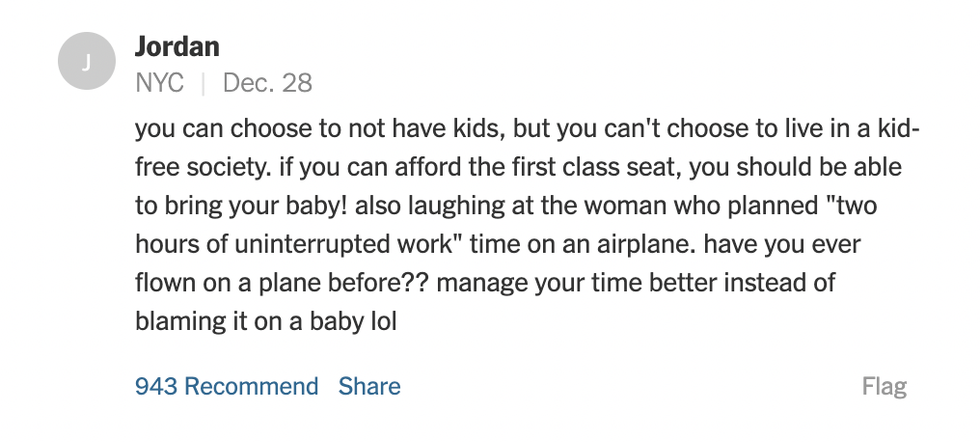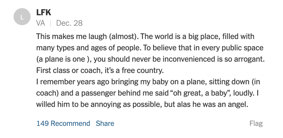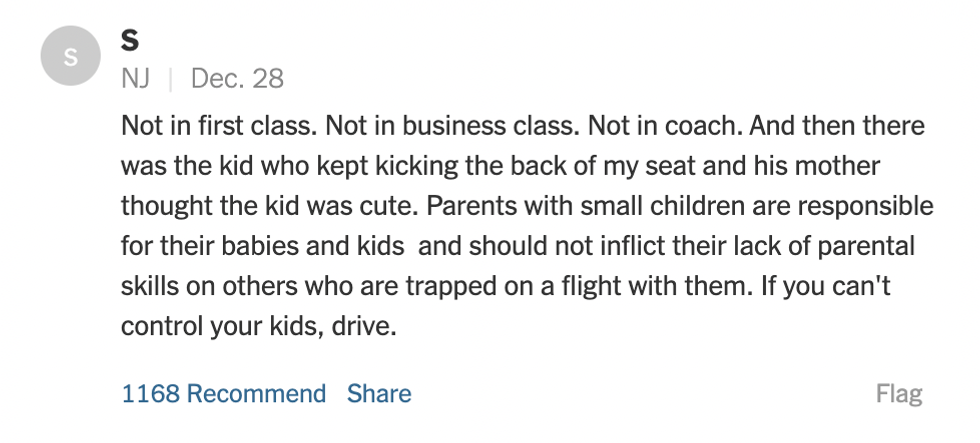 Of course, other commenters agreed with the overall feeling of The Times article, declaring that small children should not be in first class.