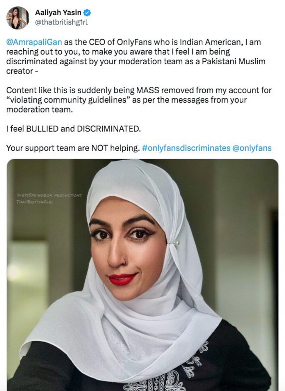 She wrote: "As the CEO of OnlyFans who is Indian American, I am reaching out to you, to make you aware that I feel I am being discriminated against by your moderation team as a Pakistani Muslim creator.