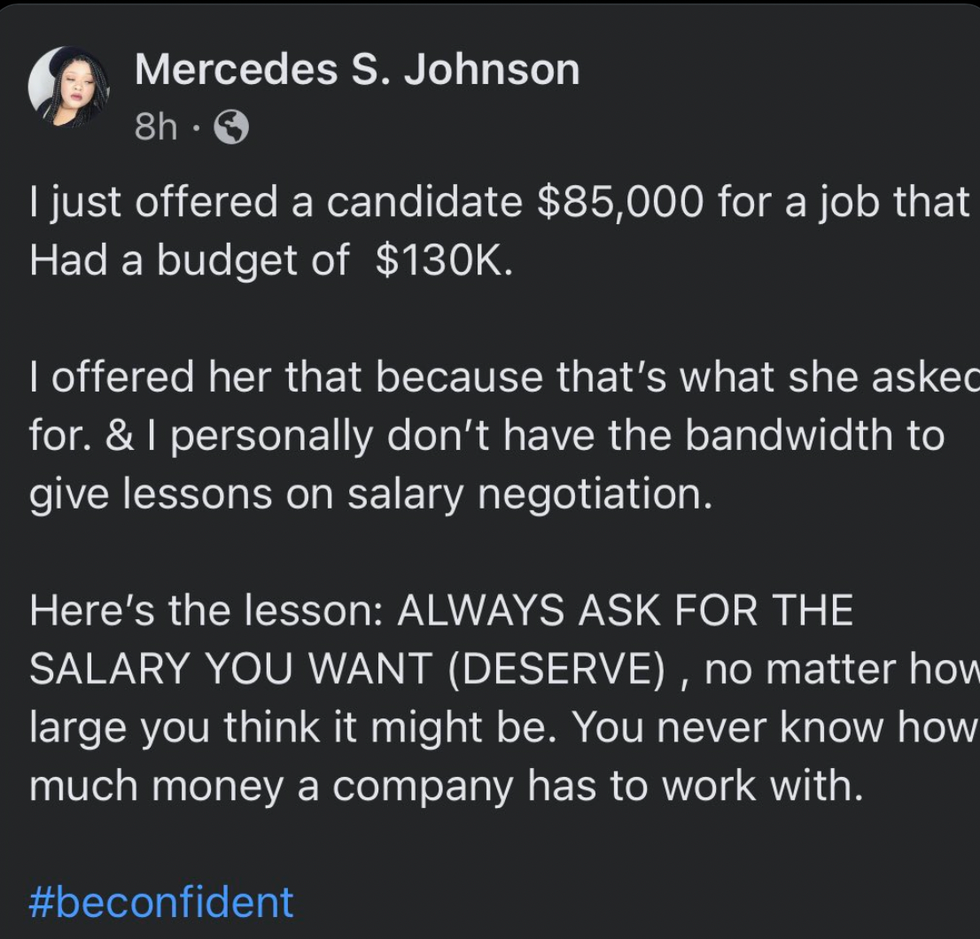 Freelance recruiter Mercedes Johnson posted on her Facebook page that she had recently offered a woman a job for $85,000 even though the company Johnson worked with actually had a budget of $130,000 for the role. “I offered her that because that’s what she asked for and I personally don’t have the bandwidth to give lessons on salary negotiation,” Johnson wrote.