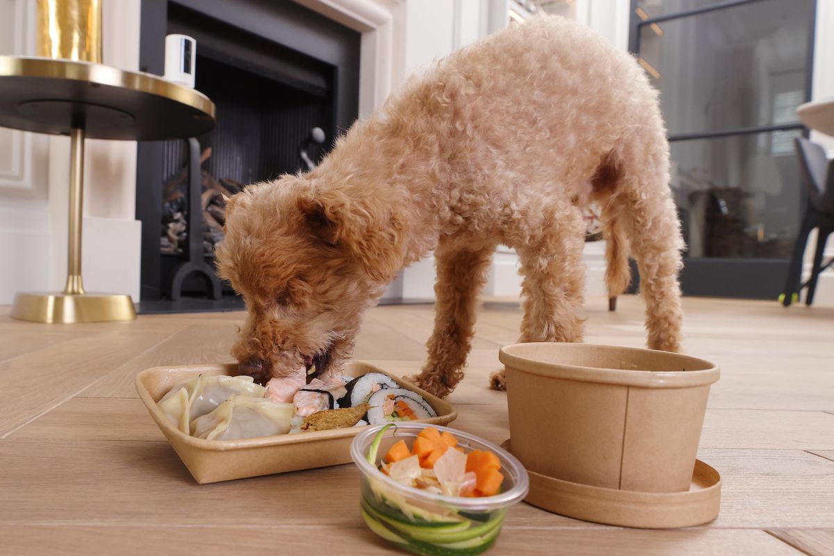 Nutritious versions of sushi (with sides of steamed dumplings and broth), meat feast pizza (served with garlic-less bread and broth ‘wine’) and lamb rogan josh (with rice, no-onion bajhi, and lassi) are all available for pet owners to order for free and give owners peace of mind.