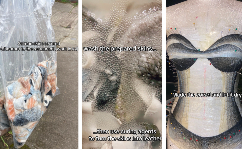 A young fashion designer has captured the eyes of the internet for taking siren wear to a whole other level using sustainably sourced salmon skin that would otherwise be discarded.