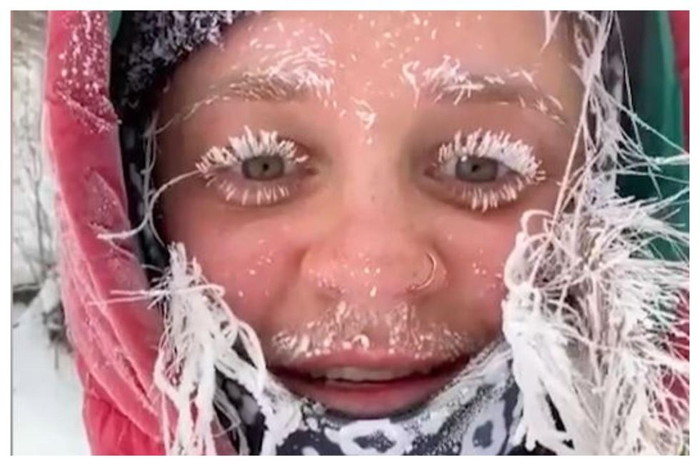 Footage shows Emily Davis's hair and eyelashes frozen solid after spending 45 minutes outside in -60F temperatures.